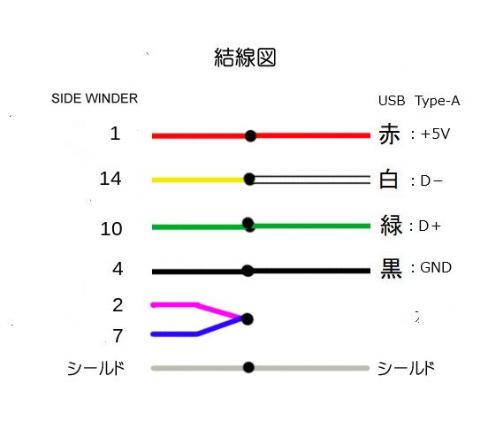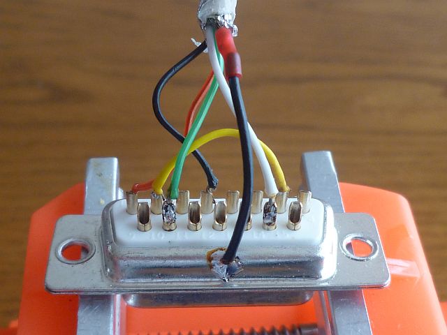 USBコネクターからの4本の線を配線図に従いD-Sub 15ピンメスコネクターに接続する。メスコネクターの2番ピンと7番ピンをジャンプする。