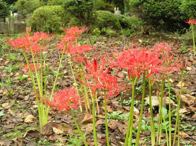 | 時期になると境内のいたる所にヒガンバナが咲き乱れます。 (撮影: 左17.09.28、 右18.08.19) |