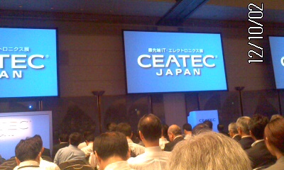 CEATEC JAPAN 2012が幕張メッセで開催された、写真は初日「キーノートスピーチ」開始前の様子です。本年の展示はスマートテレビ、スマートタウン、個人や生活、モビリティ、ビジネス、産業、社会システム全般がネットワーク技術を活用してつながり、IT・エレクトロニクスの技術革新が、我々の暮らしや社会全体を快適に、スマートな社会の構築を提案しています。また、デジタルネットワークからスマートイノベーションへ。各界のトップやオピニオンリーダーによる「キーノートスピーチ」をはじめ、海外から招待したエグゼクティブによる「ゲストスピーチ」などが開催されます。