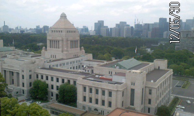 国会活動の行われる主たる場所が国会議事堂です。議事堂は昭和11年に竣工し、建築費用は当時の金額で2750万円です。建築の期間は大正9年1月から昭和11年11月の17年で、構造は鉄骨鉄筋コンクリート造、地上3階地下1階(1部4階搭屋付)長さ、206m、奥行89m、高さ21m(中央塔65.5m)です国会の裏面から見た写真ですので、右側が衆議院、左側が参議院です、中央玄関奥の広間には、伊藤博文、大隈重信、板垣退助の立像があり、衆議院玄関には、尾崎行雄、三木武夫の胸像があります。外装は3種類の花崗岩を使った石積みで、内装には33種類の大理石、2種類の蛇紋岩をはじめ、沖縄県宮古島産珊瑚石灰岩、橄欖岩、黒髪石、尾立石、日華石などが使用されている、これらの石材は日本全国から取り寄せられた。
