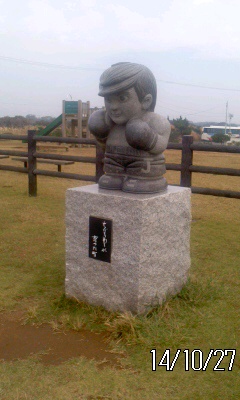 行部岬「明日のジョー」の石像 刑部岬は「天保水滸伝」で有名な飯岡助五郎が眠る、千葉県旭市(旧飯岡町)にある岬です、 敵対する笹川繁蔵、当時の著名な侠客、清水次郎長、国定忠治、大前田英五郎、さらに千葉道場の用心棒の平手造酒等が出てくる物語です「天保水滸伝」は映画、浪曲で有名になりました。 銚子市の犬岩からつづく切り立った断崖、屏風ヶ浦の南端に位置する。高さは65mで、下には飯岡漁港から九十九里浜が弓状に連なり、太東崎まで66キロの砂浜が続いています。 特に夕陽が落ちる「サンセット」の眺めは素晴らしですが、風が強い日が多いので要注意です 写真は『あしたのジョー』のキャラクターの石像です。作者のちばてつやが飯岡に在住していた時期があるための縁で像が2体置かれています。 |