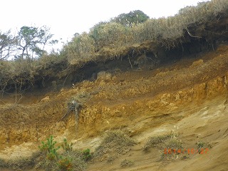 銚子ジオパーク「屏風ケ浦」 名洗町から刑部岬にかけて雄大な景観が広がる海岸の「屏風ケ浦」は東洋のドーバーとも呼ばれ、高さ35~65m、10kmにわたって続く海食崖です。海食崖は、波の浸食作用によってできた海の崖のことです。 防波堤ができる1966年頃までは年間約1mのペースで海岸が削られてきたと言われています。 屏風ケ浦で削られた砂礫は、西へ流され、九十九里浜に堆積します。屏風ケ浦では、約300万年前~約1万年前に堆積した犬吠層群、香取層、関東ローム層が観察でき、下総台地の地質構造を知ることができます。 |