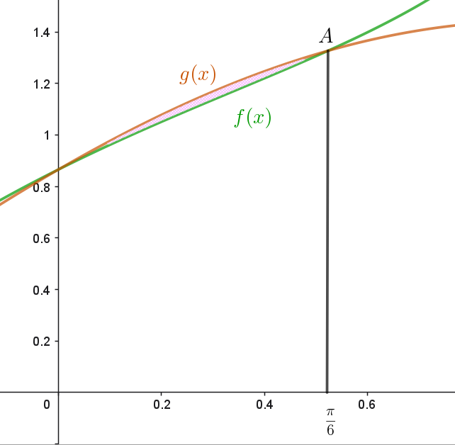 $(1) より \quad 0 \leqq x \leqq \dfrac{\pi}{6}\ \ で \ \ f(x) \leqq g(x) \ \ だから$