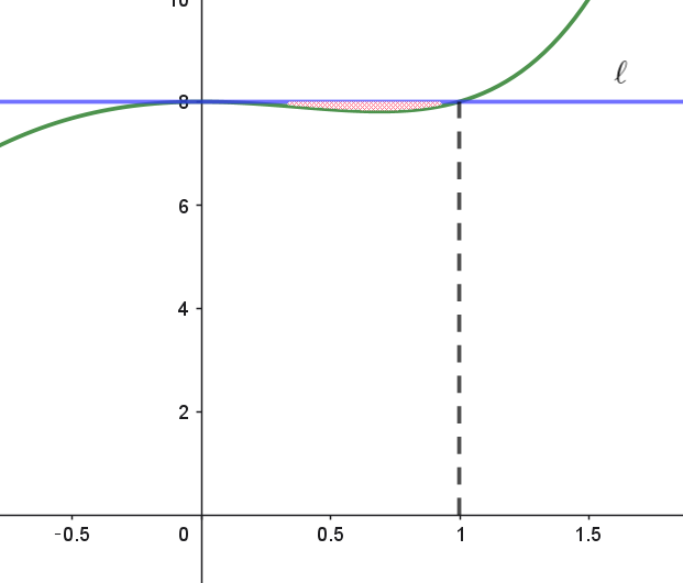 $(4)\ \ a=2 \ とし、曲線 \ y=f(x)\ 上の点(0,\ f(0))\ における接線を \ \ell \ とする。曲線 \ y=f(x)\ と接線 \ \ell \ で$