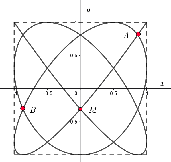 $一般に、P(\cos mt,\ \cos nt) \ \ あるいは \ \ P(\sin mt,\ \sin nt) \ \ で表される曲線を「リサージュ図形」といいます。$
