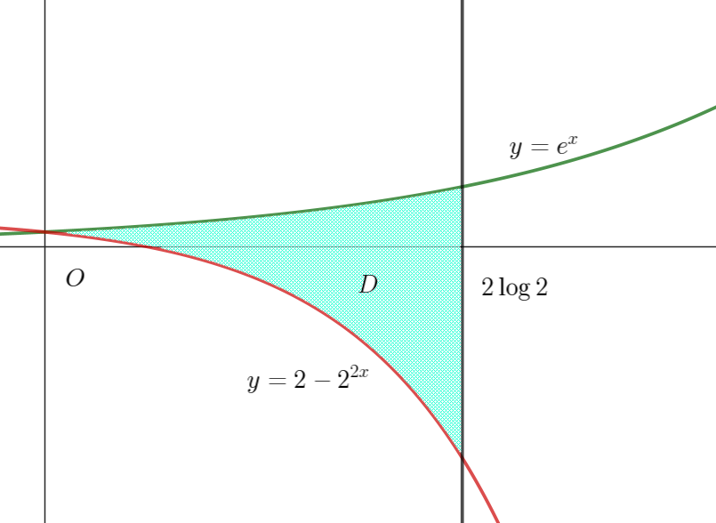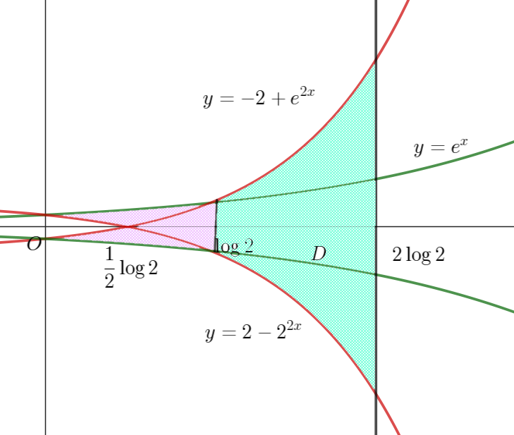 $座標平面上の\ \ 0 \leqq x \leqq 2\log 2 \ \ の範囲において、曲線 \ y=e^x \ \ と曲線 \ y=2-e^{2x},\ \ 直線 \ x=2\log 2\ \ で囲まれた$