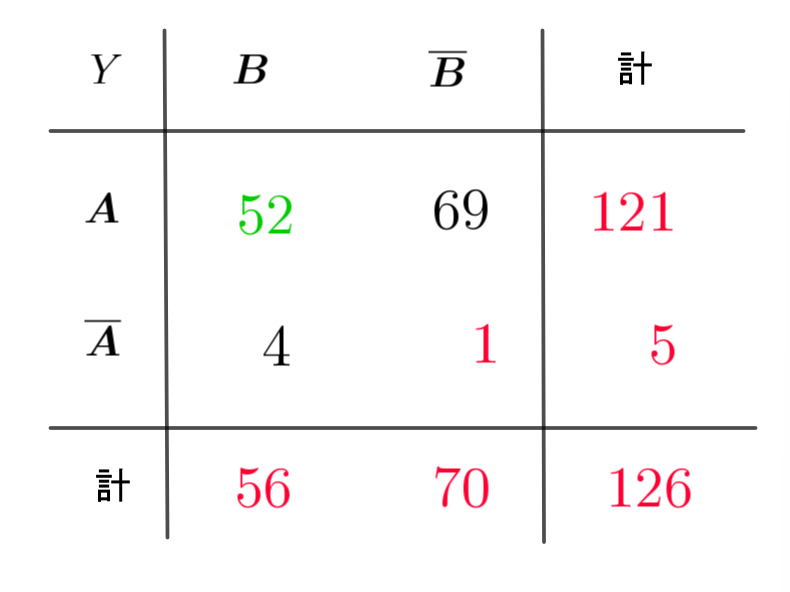 $以上のことから、事象 \ \ A \cap B, \ A \cap \overline{B},\ \overline{A} \cap B, \overline{A} \cap \overline{B}\ \ の$