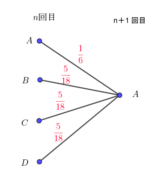 $A \longrightarrow B \longrightarrow A\ \ である確率は \quad \dfrac{5}{18} \times \dfrac{5}{18}$