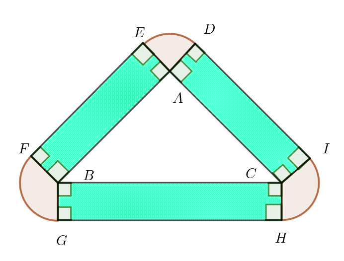 $扇型 ADE+扇型 BFG +扇型 CHI=\dfrac{\pi \times 1^2}{2\pi}(2 \theta +2(\pi -\theta))=\pi$