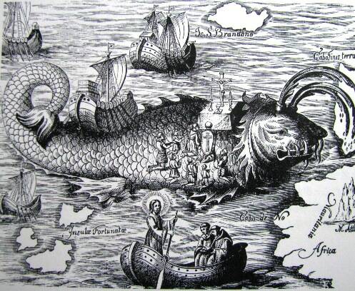われわれは、ようやくエデンの園のように美しい小さな島についた。船乗り達は上陸し、火をつけた。 あるものは料理と洗濯で忙しく、あるものは食べたり、飲んだり、浮かれたりし始めていた。 突然、船長が船から大声でさけぶのが聞こえた。 「みんな、船にもどれ、大急ぎで、何もかも捨てて、 命の限り走れ!」「これは島なんかじゃなくて海にただよう大きなクジラ島だ!」 「おまえたちが火をつけたとき、そいつは熱さを感じて動いたんだ、急げといっているんだ、さもないと もうじきクジラは海にもぐって、お前達は死んでしまうぞ!」 突然島が足元でふるえ、山のような波をかぶり、上にいたものが暴風雨の海の底に沈んだのだ。 |