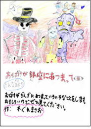 今年の工作教室では,「びっくりばこ」と「ぶんぶんゴマ」を作りました。 びっくりばこは,毎日飲んでいる給食の牛乳パックをきれいにに洗って乾かし使いました。 外からストローで息を吹き込むと中に入れたポリ袋が膨らみ飛び出してきます。こわいオバケやかわいいオバケ絵,色々あって楽しかったです。 本の中から探した工作を図書委員が工夫して作りやすく直しましので,みんな楽しく作ったり遊んだりすることができました。 |