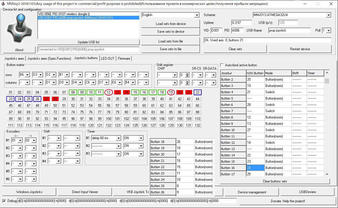 5Axes,21buttonsの配線でbutton matrixは4ROWs,7columnsです。