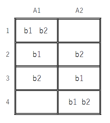 $例1 2個のボールb_1,b_2を2つの箱A_1,A_2に入れる場合$