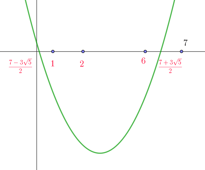 $したがって、中間値の定理より \quad 0 < \cfrac{7 - 3\sqrt{5}}{2} < 1, \quad 6 < \cfrac{7 + 3\sqrt{5}}{2} < 7 $