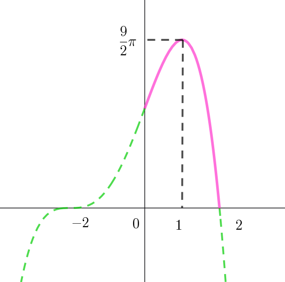 $V(1)=- \dfrac{\pi}{6} \times 3^3 \times (-1)=\dfrac{9}{2}\pi \ \ をもつ$