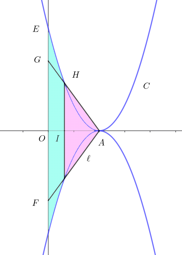 $座標平面において、曲線 \ C:y=(x-2)^2 \ \ と、C\ 上の点A(2,\ 0)\ を通る傾き \ a\ の直線 \ \ell \ を考える。ただし、$