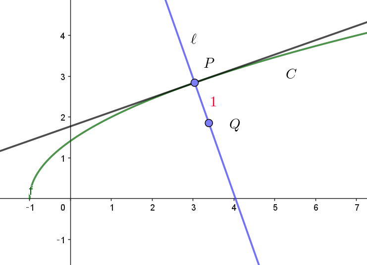 $法線を \ \ell \ とする。また、点Q(s,\ t)\ は法線 \ \ell \ 上にあり、PQ=1 \ \ かつ \ \ t < a\ \ を満たすとする。$