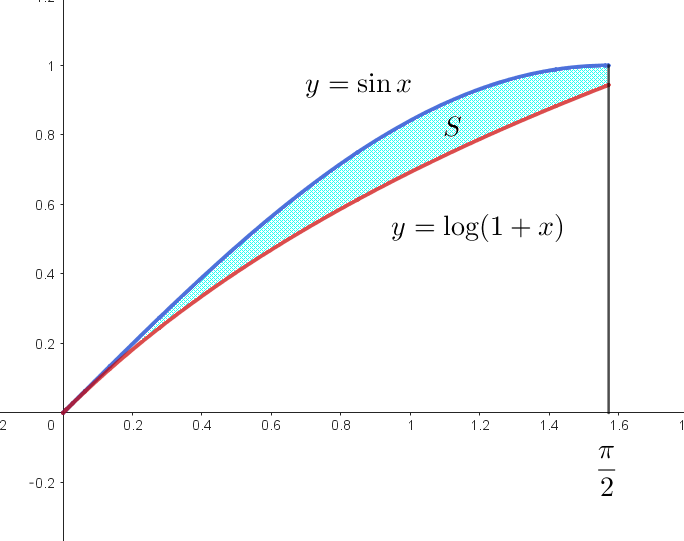 \begin{eqnarray*} S &=&\int_0^{\scriptsize{\cfrac{\pi}{2}}}(\sin x-\log(1+x))dx\\ \\ &=&\big[-\cos x-(1+x)\log(1+x)\big]_0^{\scriptsize{\cfrac{\pi}{2}}} + \int_0^{\scriptsize{\cfrac{\pi}{2}}}((1+x) \times \cfrac{1}{1+x}dx\\ \\ &=&-(1+\small{\cfrac{\pi}{2}})\log(1+\small{\cfrac{\pi}{2}})+1 +\big[ x \big]_0^{\scriptsize{\cfrac{\pi}{2}}} \\ \\ &=&-(1+\small{\cfrac{\pi}{2}})\log(1+\small{\cfrac{\pi}{2}}) + 1 + \small{\cfrac{\pi}{2}} \\ \\ &=&(1+\small{\cfrac{\pi}{2}})(1-\log(1+\small{\cfrac{\pi}{2}})) \end{eqnarray*}