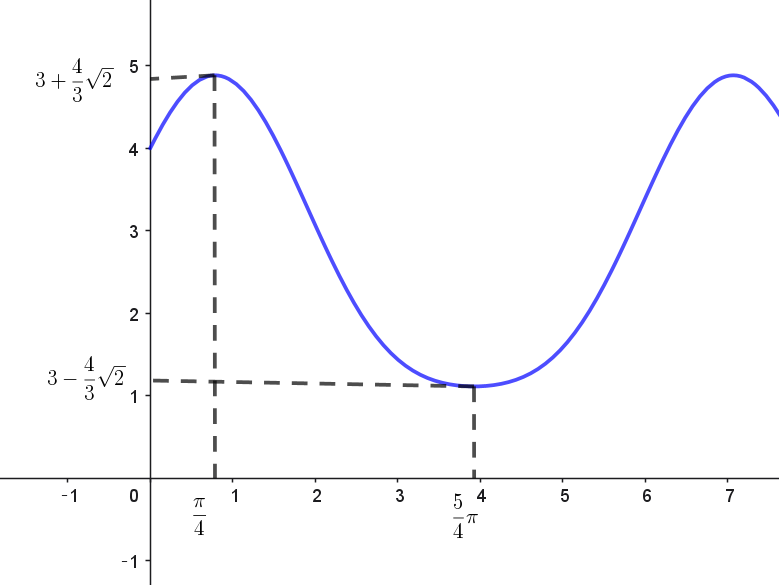 $t=\cfrac{5}{4}\pi+2k\pi \ でVは極小かつ最小となり、最小値は$