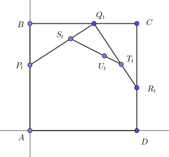 $それぞれ \ S_t,\ T_t とする。さらに、線分 \ S_tT_t\ \ を \ t:(1-t)\ \ に内分する点を \ U_t\ とする。また、点 \ A\ を \ U_0,$
