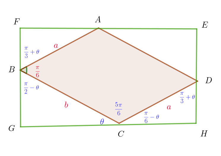 \begin{eqnarray*} S &=&FG \times GH\\ \\ &=&(FB+BG) \times (GC+CH)\\ \\ &=&(a\cos (\dfrac{\pi}{3}+\theta)+b\sin \theta ) \times (b\cos \theta +a\sin (\dfrac{\pi}{3}+\theta)\\ \\ &=&ab\cos \theta \cos (\dfrac{\pi}{3}+\theta) + a^2\sin (\dfrac{\pi}{3}+\theta)\cos (\dfrac{\pi}{3}+\theta) + b^2\sin \theta \cos \theta +ab\sin \theta \sin (\dfrac{\pi}{3}+\theta)\\ \\ &=&a^2\sin (\dfrac{\pi}{3}+\theta)\cos (\dfrac{\pi}{3}+\theta) + b^2\sin \theta \cos \theta + ab\big(\cos \theta \cos (\dfrac{\pi}{3}+\theta) + \sin \theta \sin (\dfrac{\pi}{3}+\theta)\big)\\ \\ &=&\dfrac{a^2}{2}\sin (\dfrac{2\pi}{3}+2\theta) + \dfrac{b^2}{2}\sin 2\theta + ab\cos \big((\dfrac{\pi}{3}+\theta)-\theta \big)\\ \\ &=&\dfrac{a^2}{2}\sin (\dfrac{2\pi}{3}+2\theta) + \dfrac{b^2}{2}\sin 2\theta + \dfrac{ab}{2}\\ \\ &=&\dfrac{a^2}{2}\big(\sin \dfrac{2\pi}{3}\cos 2\theta+\cos \dfrac{2\pi}{3}\sin 2\theta\big)+ \dfrac{b^2}{2}\sin 2\theta + \dfrac{ab}{2}\\ \\ &=&\big(\dfrac{b^2}{2}-\dfrac{a^2}{4}\big)\sin 2\theta + \dfrac{\sqrt{3}}{4}a^2\cos 2\theta + \dfrac{ab}{2}\\ \end{eqnarray*}